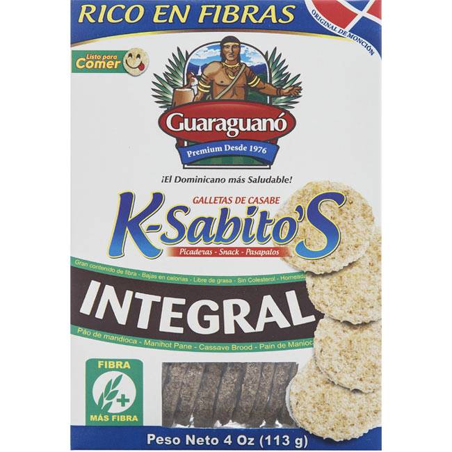K-sabitos Integral / Galletas de yuca. 100% yuca, rico en fibras, libre de gluten, apto para celiacos. Por su textura son prácticos para acompañar cualquier comida, picaderas, dietas diarias, fiestas, reuniones, catering, buffet, hoteles , entre otros. Acompañalo con mermeladas, quesos, dips. Las bondades de los k-sabitos's Guaraguanó , son extraordinaria ya que son totalmente 100% de yuca, lo cual lo hace ser un producto totalmente natural, rico en fribras, libre de gluten, apto para celiacos , no contiene grasa saturada.